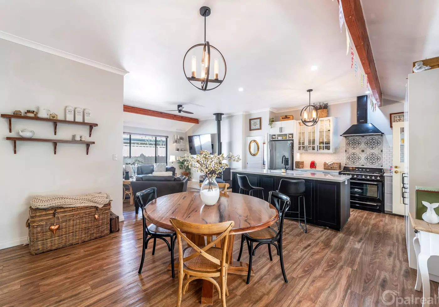 The heart of the home is the expansive open-plan kitchen, dining and living area. High ceilings, exposed beams and a stunning feature fireplace with travertine detailing give this space its wow factor, while the reverse cycle split system and ceiling fan keep things perfectly comfortable. The chef's kitchen is ready for entertaining with: