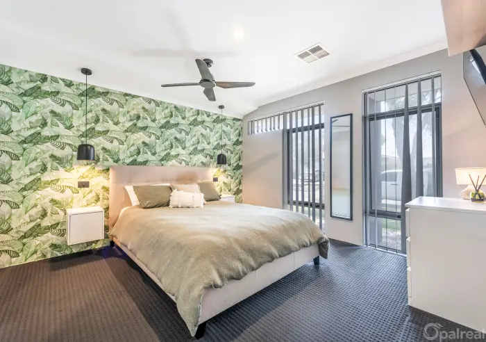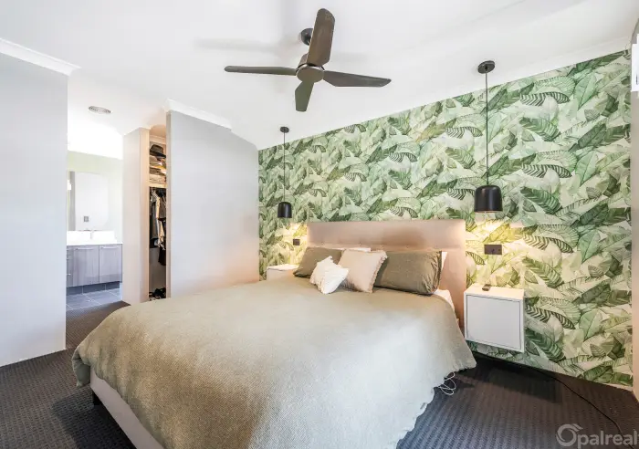 The king-sized master suite is a peaceful retreat at the front of the home, complete with dual robes, pendant lighting, ceiling fan, and feature wallpaper. The ensuite is beautifully designed with a double shower, stylish vanity, and separate toilet.